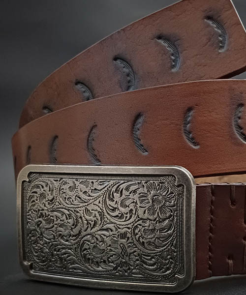 The handmade and natural colored leather belt has a single clasp with a silver metal buckle and a decorative stamps. Finished vegetable tanned leather belt contains a high percentage of beeswax and jojoba oil, so no additional care is needed.