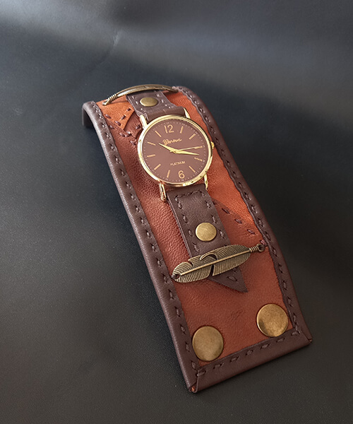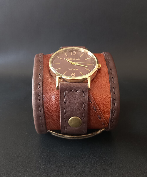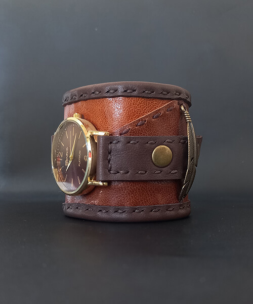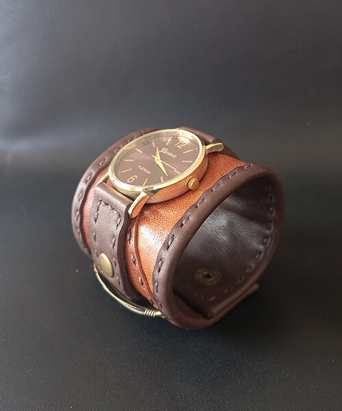 A unique, fully leather and handmade bracelet in combination of brown leather and watch has a double role. The watch on the bracelet is attached with snaps that allow you to remove it, if you want. You can wear a bracelet over a long sleeve and the harmony of the whole will elegantly step in front. Metal buttons in the snap function ensures reliable fixing.