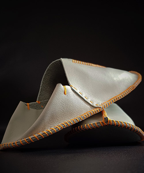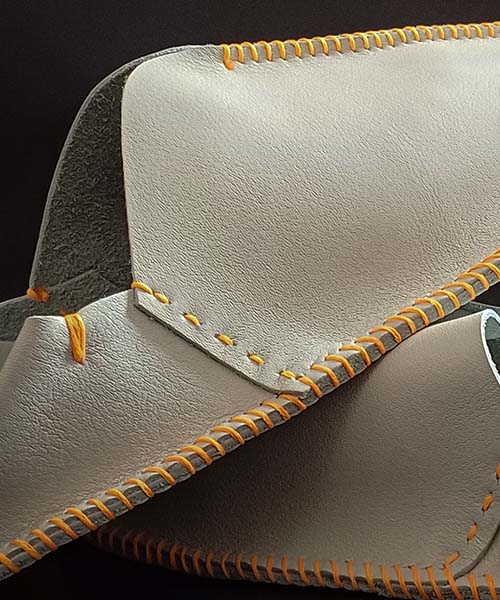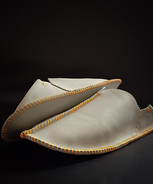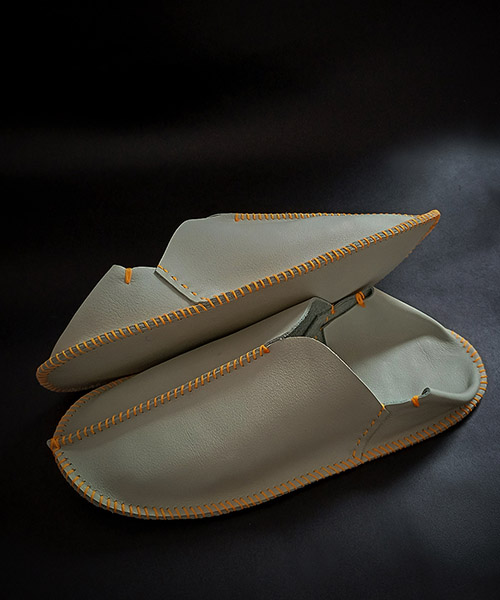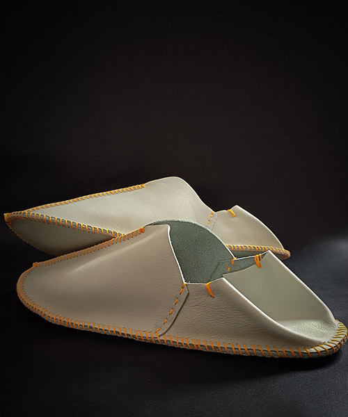 Handmade leather slippers boast a unique shape and the versatility of the material. They are decorated with colorful stitching, and are durable, soft, and pleasant to the touch.