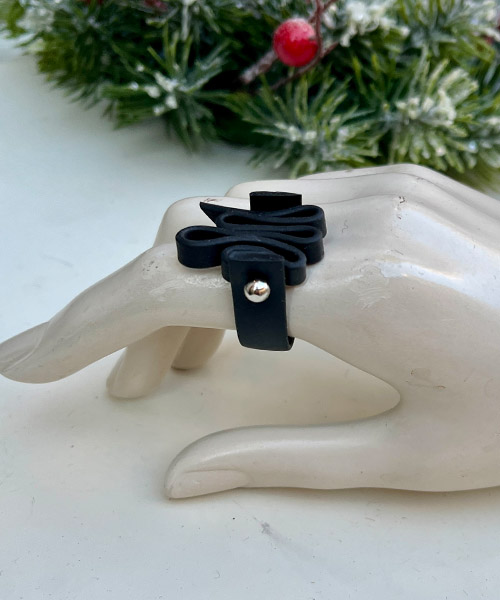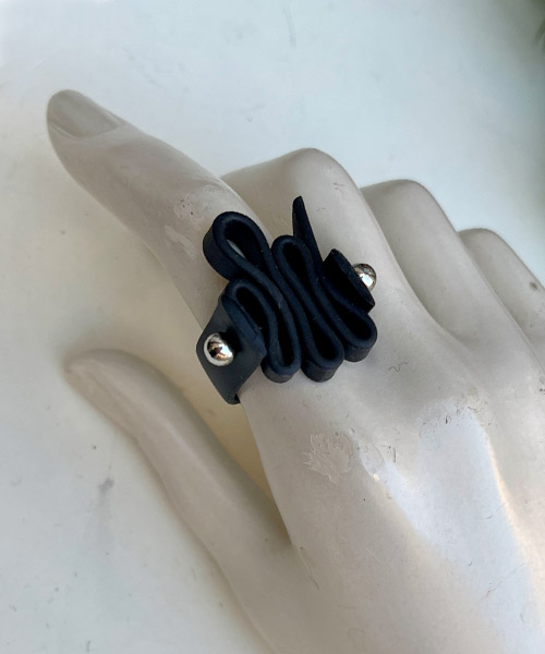 Ročno izdelan prstan iz gume (naraven kavčuk) ponuja unikatno obliko, ki jo omogoča material. Mehkoba gume zagotavlja prilagajanje, oblika pa gradi svojevrstno arhitekturno pojavnost. Odlična izbira pri izražanju vaše osebnosti in dodatek, ki prispeva k izgradnji celotnega stila.