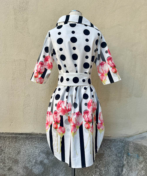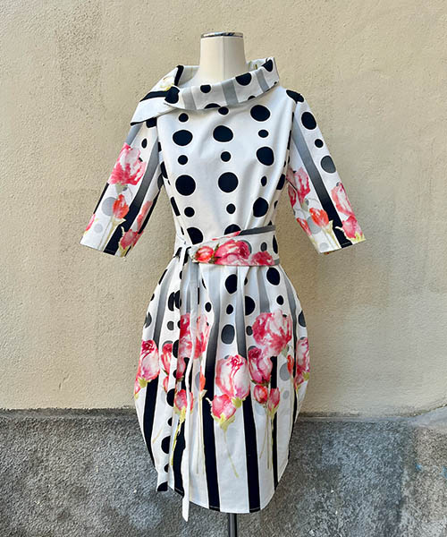 Unikatna obleka prepriča z materialom (100% bombaž) in pasom, ki je dodan celoti. Skupaj je odlična izbira za izjemne priložnosti ter za vse tiste, ki si z izbranim okusom ne želijo varne distance v izgubljeni povprečnosti.